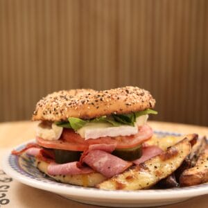 Inspirado en el clásico sandwich rioplatense, este bagel reúne un churrasquito de nalga sellado vuelta y vuelta, alioli casero, muzzarella fundida, rodajas frescas de tomate, lechuga francesa y un huevo frito que aporta textura y color. Una versión gourmet que equilibra lo crujiente, lo cremoso y lo jugoso en cada bocado.