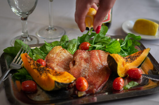 –       Pacú a la parrilla con Cabutia Asado y ensalada de Rúcula, Tomate y escamas de queso