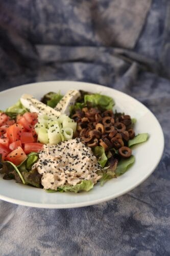 Elegante y sofisticada, combina mix de verdes, salmón fresco, tomate, palta cremosa y tiras de queso brie, con un toque final de sésamo tostado. Rica en proteínas y grasas saludables, ideal para los días de calor.
