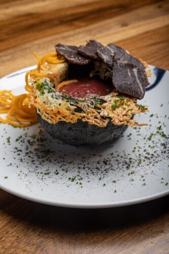 Pan de ajo negro, carne vacuna curada con sal, crema de remolacha, verduras encurtidas y queso gratinado.