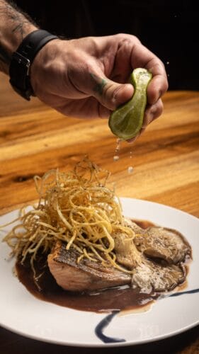 Trucha al kamado con demiglace, gírgolas y hilos de papa.