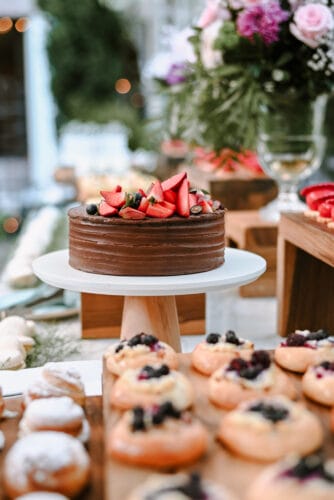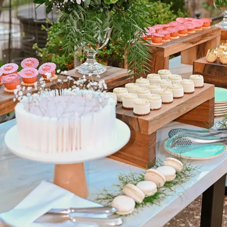 Selección dulce: Mini Domo Chocolate, Nutella y baño Rocher; Panna Cotta de Frutillas; Mini Gateaux de Vainilla, Banana y Bananas caramelizadas; Lunettes merengadas y frutos rojos; Alfajor marplatense.