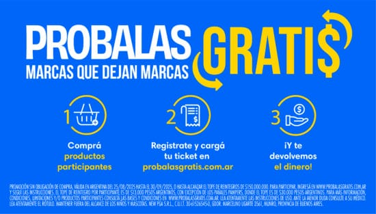 La campaña tendrá lugar entre el 25 de agosto y el 30 de septiembre o hasta alcanzar un tope total de reintegros de $150.000.000. Durante estos días, los consumidores podrán comprar los productos participantes y acceder a la devolución del dinero, cargando el ticket fiscal en la web www.probalasgratis.com.ar.