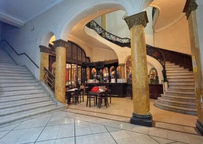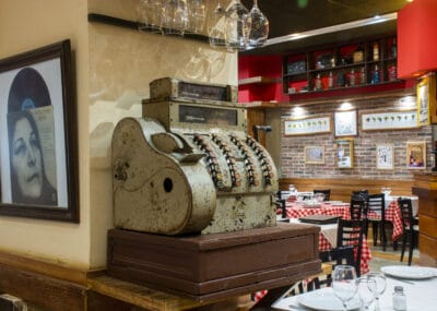 Este clásico se ubica en el edificio histórico, debajo de un maravilloso vitreaux de 1880 que acompaña la escalera de honor del histórico edificio. Allí, las especialidades son las tapas: callos, pan tumaca, boquerones e infinidades de auténticas tapas que nos harán sentir por momentos como en Barcelona. El restaurante ofrece “cuina” catalana.