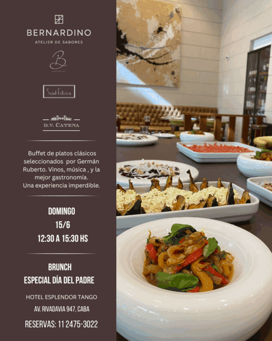 Este domingo 15 de junio de 12:30 a 15:30 hs, nos encontraremos en “Bernardino Atelier de Sabores” , para compartir un Brunch, muy especial por el día del padre en Argentina. Una idea original del chef y dueño del restaurante, ubicado en el hotel Esplendor Tango by Wyndham , Germán Ruberto.